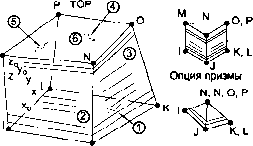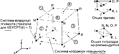 2.10.29. SOLID46 - трехмерный (3D) многослойный объемный элемент задач МДТТ с восемью узлами Описание элемента Элемент SOLTD46 является многослойной версией объемного элемента задач МДТТ с восемью узлами (SOLID45), предназначенным для моделирования толстых многослойных оболочек или объемных тел. Элемент допускает применение до 250 слоев. При необходимости использования более 250 слоев допускается применение опции пользовательской матрицы поведения материала. В качестве альтернативы допускается применение элементов, уложенных в несколько слоев. Элемент имеет три степени свободы в каждом узле: перемещения в направлении осей X, Y и Z системы координат элемента. Аналогичным элементом оболочки является элемент SHELL99. хо - ось X элемента, если ESYS не применяется. х - ось X элемента, если ESYS применяется. Исходные данные элемента Геометрия, расположение узлов н система координат элемента показаны на рис. 2.29. Элемент определяется восемью узлами, значениями толщины слоев, углом направления материала слоя и свойствами ортотропного материала. Отношение модулей сдвига GXZ и GYZ не должно превышать значения 10 ООО. Ось Z элемента определена в качестве нормали к ссылочной плоскости при помощи геометрической характеристики KREE Аргумент KREF может иметь значения 0 (срединная плоскость), i (низ) и 2 (верх). Если узлы определяют искривленную (неплоскую) поверхность, используется усредненная плоскость. По Система координат элемента при KREF=0 ![]() м ![]() J BOTTOM Опция тетраэдра. не рекомендуется Рис. 2.29. Геометрия элемента SOUD46 умолчанию ось X элемента является проекцией ребер I-J и M-N или их усредненного значения (в зависимости от значения KREF) на ссылочную плоскость. Ориентация в пределах плоскости слоев может быть изменена командой ESYS тем же самым способом, который используется для элементов оболочки, как описано в п. 2.2 Системы координат в главе 2 Описание конечных элементов комплекса ANSYS . Для изменения ориентации элементов (после автоматического построения сетки) требуется использование команды EORIENT. Путем использования команды EORIENT можно вынудить элементы SOLID46 соответствовать элементу, имеющему требуемую ориентацию, или назначить ориентацию, насколько возможно, параллельной указанной оси. Исходные данные могут представляться в матричной форме или форме слоя, в зависимости от признака KEYOPT(2). При использовании матричной формы сама матрица должна быть вычислена вне комплекса ANSYS. Соотношения усилий и моментов с деформациями в элементе, определяющие квадратичное изменение деформаций по толщине (KEYOPT(2) = 3), должны указываться в виде, описанном в п. 2.10.53 (см. Исходные данные элемента ) для восьмиузлового элемента многослойной линейной оболочки (SHELL99). Кроме того, для данного элемента игнорируются ссылки на промежуточные узлы. Температурные деформации, большинство напряжений и критерии разрушения при использовании ввода матриц не вычисляются. Для ввода слоев (а не матриц) используемые значения толщины слоев вычисляются путем масштабирования исходных геометрических характеристик - значений толщины для согласования их с расстоянием между узлами. Расположение узлов может указывать на наклон слоев или их форму, отклоняющуюся от плоскости. Однако локальная система координат для каждого слоя фактически ориентируется параллельно ссылочной плоскости. Номер слоя (LN) может изменяться