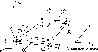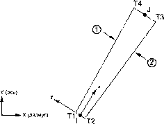 2.10.39. SHELL63 - упругая оболочка Описание элемента Элемент SHELL63 имеет возможности учета мембранного растяжения - сжатия и изгиба. Элемент имеет шесть степеней свободы в каждом узле: перемещения в направлении осей X, Y и Z узловой системы координат и повороты вокруг осей X, Y и Z узловой системы координат. Элемент имеет возможность работы с изменением жесткости при приложении нагрузок и большими перемещениями. Имеется возможность при больших перемещениях и малых поворотах применять согласованную касательную матрицу жесткости. Аналогичными элементами являются SHELL43 и SHELL181 (с возможностями пластического деформирования) и SHELL93, имеющий промежуточные узлы на гранях. Команда ETCHG преобразует элементы SHELL57 и SHELL157 в элементы SHELL63. Исходные данные элемента Геометрия, расположение узлов и координатная система элемента показаны на рис. 2.39. Элемент определяется четырьмя узлами, четырьмя значениями толщины, жесткостью упругого основания и свойствами ортотропного материала. Направление ориентации ортотропного материала связано с системой координат элемента. Ось X системы координат элемента может быть повернута на угол ТНЕТА (в градусах). ![]() Рис. 2.3Q. Геометрия элемента SHELL63 Элемент может иметь переменную толщину. Толщина предполагается гладко изменяющейся но площади элемента и указывается в четырех узлах. Если элемент имеет постоянную толщину, требуется указывать только Значение ТК(1). Если толщина не является постоянной, ее значения указываются во всех четырех узлах. Жесткость упругого основания (EFS) определяется как давление, требуемое для создания единичного перемещения основания по нормали. Если жесткость упругого основания указывается равной нулю или менее, она игнорируется. Для явно выраженных негомогенных материалов или многослойных оболочек указывается следующая геометрическая характеристика: RMI - отношение используемого изгибного момента инерции к вычисленному на основе указанного набора толщин слоев. По умолчанию RMI равно 1. Величины СТОР и СВОТ являются расстояниями от срединной поверхности до крайних волокон и используются для вычисления напряжений. Значения СТОР и СВОТ должны быть положительными, в предположении, что срединная поверхность располагается между волокнами, используемыми для вычисления напряжений. Если эти значения не указываются, напряжения вычисляются на основе исходных значений толщины. Значение ADMSUA является присоединенной на единицу площади массой. Давления могут быть указаны в качестве поверхностных нагрузок на гранях элемента, как показано номерами, обведенными окружностями на рис. 2.39. Положительное давление направлено внутрь элемента. Давления, прикладываемые на ребрах, имеют размерность силы, отнесенной к единице длины. Поперечные давления могут быть эквивалентны (сосредоточенным) элементным нагрузкам, прикладываемым в узлах (при KEYOPT(6) = 0), или распределены по грани элемента (при KEYOPT(6) = 2). Элементные эквивалентные нагрузки порождают более точные расчетные напряжения в случае использования плоских элементов ря моделирования искривленных поверхностей или при моделировании упругого основания, поскольку в элементе устранены фиктивные напряжения изгиба. Признак KEYOPT(l) применяется для удаления из матрицы жесткости при необходимости мембранной или изгибной жесткостей. При удалении изгибной ж