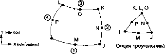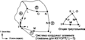 2.10.44. PLANE83 - осесимметричный гармонический элемент МДТТ с четырьмя узлами Описание элемента Элемент PLANE83 используется для моделирования двухмерных (2D) осесимметричных конструкций с неосесимметричными нагрузками. Примерами таких нагрузок являются нагрузки, вызывающие изгиб, сдвиг или кручение. Элемент определяется четырьмя узлами, имеющими три степени свободы в узле: перемещения в направлении осей X,Y и Z узловой системы координат. Для узловых систем координат, не являющихся повернутыми, эти направления соответствуют, соответственно, радиальным, осевым и касательным направлениям. Элемент является версией II порядка двухмерного (2D) элемента с четырьмя узлами PLANE25. Этот элемент обеспечивает более точные результаты для смешанных сеток (состоящих из треугольных и четырехугольных элементов), полученных средствами автоматизированного создания таковых, и допускает нерегулярную форму элемента без существенной потери точности. Данный элемент также является обобщенной версией осесимметричного двухмерного (2D) элемента с восемью узлами элемента задач МДТТ с объемным НДС, в котором нагрузки могут не являться осесимметричными. Элементы с восемью узлами имеют совместные формы перемещений и пригодны для описания искривленных границ. Исходные данные элемента Геометрия, расположение узлов и система координат для данного элемента показаны на рис. 2.44. Направления осей ортотропного материала соответствуют направлениям осей системы координат элемента. Исходные данные элемента в основном такие же, как и у элемента PLANE82, за исключением следующего: свойста материала в направлении оси Z (EZ, ALPZ и т. д.) должны указываться. Значения MODE и ISYM используются для описания характеристик гармонического нагружения. Исходные данные также включают четыре узла, число гармонических волн (узловых диаметров, указываемых аргументом MODE команды MODE), условие симметрии (аргумент ISYM команды MODE) и свойства ортотропного материала. При MODE = 0 элемент ведет себя подобно осесимметричному варианту элемента PLANE42. Признак KEYOPT(3) используется для приложения температур при значении аргумента MODE, превосходящем нуль, и свойствах материала, зависящих от температуры. Свойства материала могут оцениваться только для постоянных (не изменяющихся гармонически) температур. Если значение MODE равно нулю, свойства материала всегда оцениваются по среднему значению температу- ![]() Рис. 2.44. Геометрия элемента PLANE83 ры в элементе. Признаки KEYOPT(4), (5) и (6) обеспечивают различные опции вывода информации. Список исходных данных элемента Узлы - I,J,K,L,M,N,Q Р. Степени свободы - UX, UY, UZ. Геометрические характеристики - нет. Свойства материала - EX, EY, EZ, PRXY, PRYZ, PRXZ (или NUXY, NUYZ, NUXZ), ALPX, ALPY, ALPZ (или СТЕХ, CTEY, CTEZ или THSX, THSY, THSZ), DENS, GXY, GYZ, GXZ, DAMP. Нагрузки, прикладываемые к поверхности элемента: - давление - на грани (ребре) 1 (J-I), на грани (ребре) 2 (K-J), на грани (ребре) 3 (L-K), на грани (ребре) 4 (I-L). Объемные нагрузки: - температуры - T(I), T(J), Т(К), T(L), Т(М), T(N), Т(О), Т(Р). Номер формы (число узловых диаметров) - указывается командой MODE. Условие симметрии - указывается аргументом ISYM команды MODE: - 1 - симметричная нагрузка; - -1 - антисимметричная нагрузка. Специальные возможности: - увеличение жесткости при наличии нагрузок; - большие перемещения; - большие деформации; - рождение и смерть. KEYOPT(3) - признак использования температур при MODE, превышающем нуль