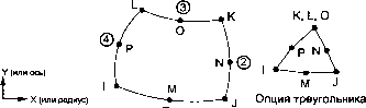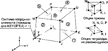 Главная » ANSYS 1 ... 20 21 22 23 24 25 26 ... 64 - функция Муни - Ривлина при KEYOPT(2) = 0; - EX при KEYOPT(2) = 1. Нагрузки, прикладываемые к поверхности элемента: - давление - на грани (ребре) 1 (J-1), на грани (ребре) 2 (K-J), на грани (ребре) 3 (L-K), на грани (ребре) 4 (I-L). Объемные нагрузки: - температуры - T(I), T(J), Т(К), T(L), Т(М), T(N), Т(О), Т(Р), в зависимости от числа узлов. Специальные возможности: - большие перемещения; - большие деформации. KEYOPT(l) - признак формулировки элемента: - 0 - элемент I порядка с четырьмя узлами; - 1 - элемент II порядка с восемью узлами. KEYOPT(2) - признак функции энергии упругих деформаций: - 0 - почти несжимаемый материал Муни - Ривлина (Mooney - Rivlin), для указания констант применяется команда TBDATA; - 1 - сжимаемый материал Блатца - Ко (Blatz-Ko). KEYOPT(3) - признак напряженно-деформированного состояния: - 0, 2 - плоское деформированное состояние; - 1 - осесимметричное НДС. KEYOPT(4) - признак системы координат элемента: - 0 - система координат элемента параллельна глобальной системе координат; - 1 - система координат элемента основана на ребре I-J недеформированно-го элемента. KEYOPT(5) - признак вывода внешних напряжений: - 0 - вывод базовых объектов; - 1 - вывод деформаций в элементе; - 2 - вывод напряжений в точках интегрирования; - 3 - вывод деформаций в точках интегрирования; - 4 - вывод узловых напряжений; - 9 - полный вывод данных (включая все опции). KEYOPT(6) - признак интегрирования: - 0 - полное интегрирование энергии деформаций; - 1 - полное интегрирование касательных членов и редуцированное интегрирование объемных членов энергии деформаций. Расчетные данные элемента Выходная расчетная информация, связанная с элементом, разделена на два вида: - дополнительные элементные объекты, перечисленные в табл. 2.45. Признак KEYOPT(5) обеспечивает различные опции вывода данных. Направления напряжений в элементе параллельны системе координат элемента.
