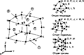 2.10.48. VISC089 - трехмерный (3D) вязкоупругий элемент с двадцатью узлами Описание элемента Элемент VISC088 является квадратичным (II порядка) изопараметрическим элементом. Элемент определяется двадцатью узлами, имеющими по три степени свободы в каждом узле: перемещения в направлении осей X, Y и Z узловой системы координат. Элемент имеет различные опции вывода данных. Исходные данные элемента Геометрия, расположение узлов и система координат элемента показаны на рис. 2.48. Элемент призматической формы может быть получен указанием идентичных координат для узлов К, L и S; узлов А и В и узлов О, Р и W. Элемент в форме тетраэдра и пирамиды также может быть создан, как показано на рис. 2.48. Элемент VISC089 использует модель вязкоупругого материала, указываемую командами ТВ и TBDATA. Таблица констант вызывается командой ТВ с аргументом Lab = = EVISC. При помощи команды TBDATA можно указать до 95 констант. Признак KEYOPT(5) обеспечивает различные опции вывода расчетных данных в элементе. ![]() Список исходных данных элемента Узлы - I, J, К, L, М, N, О, Р, Q, R, S, Т, U, V, W, X, Y, Z, А В. Степени свободы - UX, UY, UZ. Геометрические характеристики - нет. Свойства материала - DAMP, DENS и константы вязкоупругого материала. Нагрузки, прикладываемые к поверхности элемента: - давление - 1 - на грани JILK, 2 - на грани IJNM, 3 - на грани JKON, 4 - на грани KLPO, 5 - на грани LIMP, 6 - на грани MNOP. Объемные нагрузки: - температуры - T(I), TYJ),..., T(Z), Т(А), Т(В). Специальные возможности: - вязкоупругость; - увеличение жесткости при наличии нагрузок; - адаптивный спуск. KEYOPT(5) - признак вывода внешних напряжений: - О - вывод базовых объектов; - 1 - дополнительный вывод базовой информации во всех точках интегрирования; - 2 - вывод узловых напряжений. Расчетные данные элемента Выходная расчетная информация, связанная с элементом, разделена на два вида: - узловые объекты, такие как узловые перемещения, включены в полное узловое решение; - дополнительные элементные объекты, перечисленные в табл. 2.48. Таблица 2.48. Описание расчетных данных элемента VISC089
