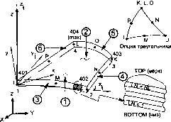 2.10.49. SHELL91 - нелинейная многослойная оболочка Описание элемента Элемент SHELL91 может применяться для расчета НДС многослойных оболочек или задач с большим количеством тонких слоев. При использовании элемент SHELL99 обычно эффективнее элемента SHELL91. При отключенной опции трехслойной конструкции можно использовать до 100 слоев. Элемент SHELL99 позволяет большее число слоев, но без нелинейных свойств материалов. Элементом многослойного объемного тела является SOLID46. Элемент имеет шесть степеней свободы в каждом узле: перемещения в направлении осей X, Y и Z узловой системы координат и повороты вокруг осей X, Y и Z узловой системы координат. Исходные данные элемента Геометрия, расположение узлов и координатная система элемента показаны на рис. 2.49. Элемент определяется восемью узлами, толщиной слоев, углом направления свойств материала (направлением системы координат материала) и свойствами ортотропного материала. Промежуточные узлы элемента не могут быть удалены. Треугольный элемент может быть создан путем указания одних и тех же координат для узлов К, L и О. При создании модели с числом слоев, меньшим трех, элемент SHELL91 более эффективен, чем SHELL99. ![]() Локальная (местная) система координат для каждого слоя является правой, ось X может быть повернута на угол ТНЕТА (в градусах, указывается в качестве геометрической характеристики) по отношению к оси X системы координат элемента в направлении оси Y элементной системы координат. Общее число слоев (не свыше 100) должно указываться (посредством NL). Если свойства слоев симметричны относительно срединной поверхности элемента (LSYM = 1), указываются свойства только половины слоев, включая средний (если таковой имеется). В противном случае (LSYM = 0) требуется указывать свойства всех слоев. Значение ADMSUA является присоединенной на единицу площади массой. Свойства материала могут быть ортотропными относительно плоскости элемента. Геометрическая характеристика МАТ используется для назначения номера материала вместо номера материала, назначаемого командой МАТ. По умолчанию, если не указывается, геометрическая характеристика МАТ имеет значение 1. Ось X свойств материала соответствует локальному направлению системы координат слоя X. Для присвоения значений ссылочных температур и демпфирования используются команды TREF и BETAD соответственно. Альтернативой является использование команд MAT.REFT для указания ссылочной температуры или MAT.DAMP для демпфирования; номера материалов слоев в этом случае игнорируются. Каждый слой элемента многослойной оболочки может иметь переменную толщину (ТК). Толщина считается билинейно изменяющейся по поверхности элемента и указывается в четырех угловых узлах. Если слой имеет постоянную толщину, требуется указывать только значение ТК(1). Если толщина не является постоянной, ее значения указываются во всех четырех угловых узлах. При наличии нелинейных свойств материала толщина слоя не должна превышать трети полной толщины элемента. Общая толщина каждого конечного элемента оболочки должна быть меньше удвоенного радиуса крутки оболочки и меньше одной пятой радиуса кривизны оболочки. При использовании опции трехслойной оболочки (KEYOPT(9) = 1) элемент использует свойства трехслойной оболочки. Эти свойства специально учитывают применение трехслойной оболочки, в которой имеются тонкие на