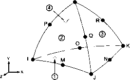Таблица 2.49. Описание расчетных данных элемента SHELL91 (продолжение) Объект Определение NL: SEPL XC, YC, ZC FC1,...,FC6, FCMAX VALUE EPELF (X, Y, Z, XY, YZ, XZ) SF (X, Y, Z, XY, YZ, XZ) LAYERS ILSXZ ILSYZ ILANG ILSUM LN1, LN2 ILMAX T(X,Y,XY) M(X,Y,XY) N(X,Y) Эквивалентное напряжение по диаграмме деформирования Координата слоя в глобальной системе координат Значение критерия разрушения и максимум в каждой из точек интегрирования, выводятся только при KEYOPT(5) = 3 Номер критерия разрушения (FC1 - FC6, FCMAX) Максимальное значение для данного критерия разрушения, если таковое превосходит 9999.999, указывается 9999.999 Номер слоя, в котором достигнут максимум Упругие деформации в локальной системе координат слоя, вызвавшие максимальное значение критерия разрушения в элементе Напряжения в локальной системе координат слоя, вызвавшие максимальное значение критерия разрушения в элементе Расположение стыка слоев Сдвиговое напряжение SXZ Сдвиговое напряжение SYZ Угол направления вектора касательных напряжений (измеряется от оси X системы координат элемента в направлении оси Y системы координат элемента) в градусах Векторная сумма касательных напряжений Номера слоев, между которыми находится стык с максимальными касательными напряжениями (ILMAX) Максимальное касательное напряжение между слоями (достигаемое между LN1 и LN2) Усилия, действующие в плоскости элемента (в системе координат элемента) на единицу длины Моменты, действующие в плоскости элемента (в системе координат элемента) на единицу длины Перерезывающие силы 2.10.50. SOLID92 - элемент объемных (3D) задач МДТТ с десятью узлами (тетраэдр) Описание элемента Элемент SOLID92 является квадратичным элементом (II порядка), пригодным для моделирования нерегулярных сеток (создаваемых при импорте геометрической информации из различных комплексов CAD). Элементом - гексаэдром с двадцатью узлами является элемент SOLID95. Элемент определяется десятью узлами, имеющими три степени свободы в каждом узле: перемещения в направлении осей X, Y и Z узловой системы координат. Элемент имеет свойства пластичности, ползучести, радиационного набухания, изменения жесткости при приложении нагрузок, больших перемещений и больших деформаций. ![]() Рис. 2.50. Геометрия элемента SOLID92 Помимо узлов, элемент определяется свойствами ортотропного материала. Направления осей ортотропного материала соответствуют направлениям системы координат элемента. Список исходных данных элемента Узлы - I, J, К, L, М, N, О, Р, Q, R. Степени свободы - UX, UY, UZ. Геометрические характеристики - нет. Свойства материала - EX, EY, EZ, PRXY, PRYZ, PRXZ (или NUXY, NUYZ, NUXZ), ALPX, ALPY, ALPZ (или СТЕХ, CTEY, CTEZ или THSX, THSY, THSZ), DENS, GXY, GYZ, GXZ, DAMP. Нагрузки, прикладываемые к поверхности элемента: - давление - на грани 1 (J-I-K), грани 2 (I-J-L), грани 3 (J-K-L), грани 4 (K-I-L). Объемные нагрузки: - температуры - T(I), T(J), Т(К), T(L), Т(М), T(N), Т(О), Т(Р), T(Q), T(R); - поток частиц - FL(I), FL(J), FL(K), FL(L), FL(M), FL(N), FL(O), FL(P), FL(Q), FL(R). Специальные возможности: - пластичность; - ползучесть; - радиационное набухание; - увеличение жесткости при наличии нагрузок; - большие перемещения; - большие деформации; - рождение и смерть; - адаптивный спуск; - импорт начальных напряжений. KEYOPT(5) - признак вывода внешних напряжений: - О - вывод базовых объектов; - 1 - повторение вывода базовых объектов для всех точек интегрирования; - 2 - вывод узловых напряжений. KEYOPT(6) - признак вывода информации на поверхностях: - О - базовый вывод информации; - 4 - вывод результатов на поверхност