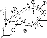 2.10.51. SHELL93 - оболочка с восемью узлами Описание элемента Элемент SHELL93 обычно используется для моделирования искривленных оболочек. Элемент имеет шесть степеней свободы в каждом узле: перемещения в направлении осей X, Y и Z узловой системы координат и повороты вокруг осей X, Y и Z узловой системы координат. Вид перемещений является квадратичным в обоих направлениях в плоскости элемента. Элемент имеет свойства пластичности, изменения жесткости при приложении нагрузок, больших перемещений и больших деформаций. Исходные данные элемента Геометрия, расположение узлов и координатная система элемента показаны на рис. 2.51. Элемент определяется восемью узлами, четырьмя значениями толщины и свойствами ортотропного материала. Промежуточные узлы элемента не могут быть удалены. Треугольный элемент может быть создан путем указания одних и тех же значений координат для узлов К, L и О. Направление ориентации ортотропного материала связано с системой координат элемента. Ось X системы координат элемента может быть повернута на угол ТНЕТА (в градусах) в направлении оси Y. Элемент может иметь переменную толщину. Толщина предполагается гладко изменяющейся по площади элемента и указывается в четырех узлах. Толщина в промежуточных узлах равна среднему значению толщины в связанных с промежуточным угловых узлах. Если элемент имеет постоянную толщину, требуется указывать только значение ТК(1). Если толщина не является постоянной, ее А ![]() Опция треугольника ![]() К, L, О Рис. 2.51. Геометрия элемента SHELL93 значения указываются во всех четырех узлах. Если толщина конечного элемента оболочки больше удвоенного радиуса крутки оболочки, комплекс ANSYS производит сообщение об ошибке. Если толщина конечного элемента оболочки больше одной пятой радиуса кривизны оболочки и меньше удвоенного радиуса крутки оболочки, комплекс ANSYS производит сообщение о предупреждении. Значение ADMSUA является присоединенной на единицу площади массой. Список исходных данных элемента Узлы-IJ, К, L, M,N, О, Р. Степени свобод - UX, UY, UZ, ROTX, ROTY, ROTZ. Геометрические характеристики: - ТК(1) - толщина в узле I; - TK(J) - толщина в узле J; - ТК(К) - толщина в узле К; - TK(L) - толщина в узле L; - ТНЕТА - поворот оси X свойств материала; - ADMSUA - добавленная масса, отнесенная на единицу поверхности. Свойства материала - EX, EY, EZ, ALPX, ALPY, ALPZ, (PRXY, PRYZ, PRXZ или NUXY NUYZ, NUXZ), DENS, GXY, GYZ, GXZ, DAMP. Нагрузки, прикладываемые к поверхности элемента: - давление - грань 1 (I-J-K-L) (низ, в направлении +Z); грань 2 (I-J-K-L) (верх, в направлении -Z); грань 3 Q-I); грань 4 (K-J); грань 5 (L-K); грань 6 (I-L). Объемные нагрузки: - температуры - Tl, Т2, ТЗ, Т4, Т5, Т6, Т7, Т8. Специальные возможности: - большие деформации; - рождение и смерть; - адаптивный спуск. KEYOPT(4) - признак системы координат элемента: - О - пользовательская подпрограмма для определения системы координат элемента не применяется; - 4 - ось X элемента определяется пользовательской подпрограммой USERAN (информацию о подпрограммах пользователя см. в Руководстве по объектам, программируемым пользователем ). KEYOPT(5) - признак вывода результатов: - О - базовая форма вывода результатов; - 1 - повторение базовой формы вывода результатов во всех точках интегрирования и на нижней, средней и верхней поверхностях; - 2 - вывод узловых результатов (информацию о подпрограммах пользователя см. в Руководстве по объектам, программируемым пользователем ). KEYOPT(6) - призна