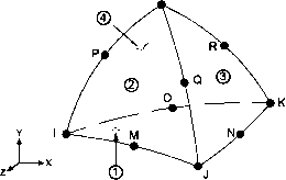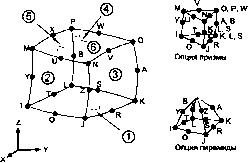 2.10.60. SOLID147- трехмерный р-элемент - гексаэдр задач МДТТ Описание элемента SOLID147 является трехмерным р-элементом с максимальной степенью интерполяционного многочлена, равной восьми. Элемент содержит двадцать узлов, имеющих по три степени свободы - перемещения по осям X, Y и Z. Элемент может иметь произвольную пространственную ориентацию. Исходные данные элемента Геометрия элемента, узлы и координатная система показаны на рис. 2.60. Промежуточные узлы элемента не могут быть удалены. Элемент в форме призмы может быть получен путем присвоения одного и того же номера узлам К, L и S, узлам А и В и узлам О, Р и W. В дополнение к узлам элементные входные данные включают свойства орто-тропных материалов. Ортотропные материалы имеют систему координат, параллельную глобальной. Список исходных данных элемента Узлы - I, J, К, L, М, N, О, Р, Q, R, S, Т, U, V, W, X, Y, Z, А, В. Степени свободы - UX, UY, TJZ. Геометрические характеристики - нет. Свойства материала - EX, EY, EZ, PRXY, PRYZ, PRXZ (или NUXY, NUYZ, NUXZ), ALPX, ALPY, ALPZ (или СТЕХ, CTEY, CTEZ или THSX, THSY, THSZ), DENS, GXY. Нагрузки, приложенные к поверхности: - давление - на грани 1 (узлы J-I-L-K), награни 2 (узлы I-J-N-M), награни 3 (узлы J-K-O-N), на грани 4 (узлы K-L-P-O), на грани 5 (узлы L-I-М-Р), на грани 6 (узлы M-N-O-P). Объемные нагрузки: - температура - Т (I), T(J),T(Z), Т(А), Т(В). Специальные возможности - нет. KEYOPT(l) - признак начальной степени интерполяционного многочлена: ![]() Л , N, О, Р, и. V. W. X Рис. 2.60. Геометрияэлемента SOLID 147 - N- начальная степень интерполяционного многочлена (2<N< 8). KEYOPT(2) - признак окончательной степени интерполяционного многочлена: - О (и по умолчанию) - используется общая конечная степень интерполяционного многочлена (см. описание команды PPRANGE); - N- конечная степень интерполяционного многочлена (2 £ N < 8). Расчетные данные элемента Расчетная информация, связанная с элементом, разделена на два вида: - узловые объекты, такие как узловые перемещения, включены в полное узловое решение; - дополнительные элементные объекты, перечисленные в табл. 2.60. Таблица 2.60. Описание расчетных данных элемента SOLID147 Объект Определение