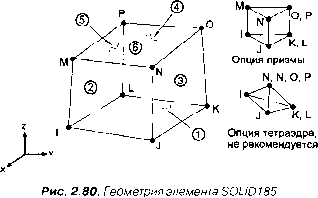 2.10.81. SOLID186 - трехмерный (3D) элемент объемного НДС с двадцатью узлами Описание элемента Элемент SOLID18G является трехмерным (3D) квадратичным элементом задач МДТТ с двадцатью узлами. Элемент SOLID186 имеет квадратичное представление перемещений и в состоянии использовать нерегулярную форму сетки (например, создаваемых на основе моделей, импортированных из различных комплексов CAD). Элемент определяется двадцатью узлами, имеющими три степени свободы в каждом узле: перемещения в. направлении осей X, Y и Z узловой системы координат. Элемент может иметь произвольную ориентацию в пространстве. Элемент SOLID 186 имеет свойства пластичности, гиперупругости, ползучести, изменения жесткости при приложении нагрузок, больших перемещений и больших деформаций; смешанную формулировку для расчета почти несжимаемых упруго-пластических материалов и полностью несжимаемых гиперупругих материалов. Для контроля вывода данных имеются специальные опции. Исходные данные элемента M,N, О, Р, U.V, W, X Ti К' L S Опция тетраэдра М. N. О, Р, U, V, W. X А ![]() О -j Опция призмы Рис. 2.81. Гсометрия элемента SOLID 186 мы также показаны на рис. 2.81. Аналогичным элементом тетраэдра с десятью узлами является элемент SOLID187. Помимо узлов, элемент определяется свойствами анизотропного материала. Направления осей анизотропного материала соответствуют направлениям системы координат элемента. Команда ESYS может использоваться для указания Ориентации свойств материала и расчетных'деформаций и напряжений. Команда RSYS может использоваться для указания расчета объектов в системе координат материала или-в глобальной системе координат. При использовании гиперупругих материалов вывод напряжений и деформаций всегда проводится в глобальной декартовой системе координат, вне зависимости от систем координат материала и элементов. Признак KEYOPT(6) - 1 указывает использование смешанной формулировки. Список исходных данных элемента Узлы - I, J, К, L, М, N, О, Р, Q, R, S, Т, U, V, W, X, Y, Z, Д В. Степени свободы - UX, UY, UZ. Геометрические характеристики - нет. Свойства материала - EX, EY, EZ, PRXY, PRYZ, PRXZ (или NUXY, NUYZ, NUXZ), ALPX, ALPY, ALPZ (или СТЕХ, CTEY, CTEZ или THSX, THSY, THSZ), DENS, GXY, GYZ, GXZ, DAMP. Нагрузки, прикладываемые к поверхности элемента: - давление - на грани 1 (J-I-L-K), грани 2 (I-J-N-M), грани 3 (J-K-0-N), грани 4 (K-L-P-O), грани 5 (L-I-M-P), грани 6 (M-N-O-P). Объемные нагрузки: - температуры - T(I), T(J),T(K), T(L), Т(М), T(N), Т(О), Т(Р), T(Q), T(R), T(S), Т(Т), T(U), T(V), T(W), T(X), T(Y), T(Z), T(A), T(B). Специальные возможности: - пластичность; - гиперупругость; - вязкоупругость; - вязкопластичность; - ползучесть; - увеличение жесткости при наличии нагрузок; . - большие перемещения; - большие деформации; - импорт начальных напряжений; - рождение и смерть; - автоматический выбор технологии элемента. Поддерживаются следующие типы таблиц данных (используемых для указания моделей материала), связанные с командой ТВ: ANEL, BISO, MISO, NLISO, BKIN, MKIN, KINH, СНАВОСНЕ, HILL, RATE, CREEP, HYPER, PRONY, SHIFT, CAST, SMA и USER. KEYOPT(2) - признак технологии элемента: - 0 - полный метод интегрирования с В-сеточным методом; - 1 - равномерное редуцированное интегрирование с контролем искажения формы; - 2 - расширенная формулировка деформаций; - 3 - упрощенная расширенная формулировка деформаций. KEYOPT(6) - признак формулировки элемента: - 0 - используется чистая формулировка для перемещений (и по умолчанию); - 1 - используется смешанная и-Р формулировка. KEYOPT(IO) - признак опции использования ввода начальных на