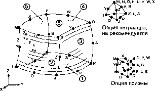 2.10.86. SOLID191 - трехмерный (3D) многослойный объемный элемент задач МДТТ с двадцатью узлами Описание элемента Элемент>б1.Ш191 является многослойной версией объемного элемента задач МДЗТс двадцатью узлами (SOLID95), предназначенного для моделирования толстых многослойных оболочек или объемных тел. Элемент допускает применение до 100 слоев. При необходимости использования более 100 слоев допускается применение элементов, уложенных в несколько слоев. Элемент определяется двадцатью узлами, имеющими три степени свободы в каждом узле: перемещения в направлении осей X, Y и Z системы координат элемента. Элемент поддерживает свойство изменения жесткости при приложении нагрузки. Для элемента могут применяться различные опции вывода результатов. Аналогичным элементом с восемью узлами является SOLID46. Аналогичным элементом оболочки является элемент SHELL91. Исходные данные элемента Геометрия, расположение узлов и система координат элемента показаны на рис. 2.86. Элемент определяется двадцатью узлами, значениями толщины слоев, углами направления материала слоя и свойствами ортотропного материала. Отношение модулей сдвига GXZ и GYZ не должно превышать значения 10 000. Для изменения ориентации элементов (после автоматического построения сетки) требуется использование команды EORIENT. Путем использования команды EORIENT можно вынудить элементы SOLID 191 соответствовать элементу, имеющему требуемую ориентацию, или назначить ориентацию, насколько возможно, параллельной указанной оси. Ось Z элемента определена в качестве нормали к ссылочной плоскости при помощи геометрической характеристики ![]() KREF. По умолчанию ось X элемента является проекцией ребер I-J и M-N на ссылочную плоскость. Ориентация в пределах плоскости слоев может быть изменена командой ESYS тем же самым способом, который используется для элементов оболочки, как описано в п. 2.2 Системы координат в главе 2. Общее количество слоев (до 100) должно быть указано (NL). Если свойства слоев являются симметричными относительно срединной rToTserjXHOcra элемента (LSYM = 1), требуется указывать только половину свойств, вш1гЗ!бьдо среднего слоя (если таковой имеется). В противном случае (LSYM = 0) требуетхщ^указы-вать свойства всех слоев. Свойства материала каждого слоя могут являться ортотропными в плоскости4* элемента. Геометрическая характеристика МАТ используется для указания номера материала слоя вместо номера материала, присваиваемого элементу командой МАТ. Если номер не указывается, по умолчанию МАТ равно 1. Направление оси X для материала соответствует направлению X локальной системы координат слоя. Для указания глобальных значений демпфирования используется команда BETAD. Если для номера материала элемента применена команда MP.DAMP (номер указан командой МАТ), для элемента используется это значение, а не значение, указанное командой BETAD. Аналогично для указания глобального значения ссылочной температуры применяется команда TREF. Если для номера материала элемента применена команда MP.REFT, для элемента используется это значение, а не значение, указанное командой TREF. Но если для номера материала слоя применена команда MP,REFT, используется это значение, а не значение, указанное в качестве глобального или элементного. Каждый слой многослойного объемного элемента может иметь переменную толщину (ТК). Толщина слоя считается изменяющейся б