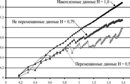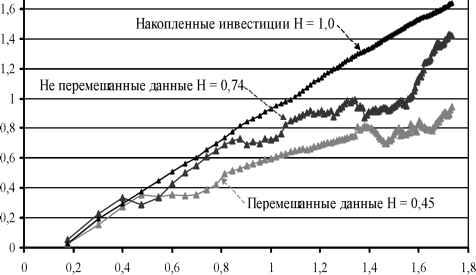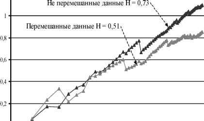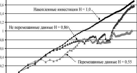 Главная » Временной ряд О наследственной памяти временных рядов Кятов Н.Х. (kyatov@mail.ru) Карачаево-Черкесская государственная технологическая академия Объектом исследования настоящей работы являются такие экономические временные ряды как инвестиции в основной капитал, объемы жилищного строительства и т.п. в различных регионах страны. Они редко бывают упорядоченными и простыми. Они хаотичны и сложны. Характеризуются непредсказуемостью, внезапными скачками и падениями, непонятными трендами характерными для нынешней российской экономики в регионах с ее затянувшимся упадком и неразберихой. В подобных рядах одним из важнейших аспектов является качественный аспект, проистекающий из того обстоятельства, что люди принимают решения и как они реагируют, когда стоят перед лицом возможных приобретений или потерь. Люди полны предубеждений. Они могут не реагировать на информацию сразу после ее получения. Вместо этого они могут откликаться на нее некоторое время спустя. На них влияют все, что происходит вокруг. Их ожидания будущего проистекают из опыта. Это эффект обратной связи, эхо прошлого, влияющее на настоящее, и настоящее, влияющее на будущее [1]. Подобные ряды с обратной связью включают долговременные корреляции и тренды [2], потому что наделены наследственной памятью о давних событиях, которые влияют на решения в настоящем. Во временных рядах мы имеем явный разрыв между тем, что говорит разум, и тем, что подсказывает интуиция. Разум говорит, что в них не существует порядка, а интуиция говорит нам - здесь что-то есть, но не понятно, что именно. При их прогнозировании можно ожидать следующего [1]: 1. Долговременных корреляций и трендов (эффект обратной связи). 2. Изменчивости, с критическими уровнями - при определенных условиях и в определенное время. 3. При уменьшаемых временных промежутках они будут выглядеть одинаково и иметь подобные статистические характеристики (фрактальная структура). 4. Уменьшения надежности предсказаний, по мере того как эти предсказания будут стремиться заглядывать все дальше вперед (чувствительная зависимость от начальных условий). Как установлено в работе [1] персистентные временные ряды обладают определенной структурой. Для них порядок данных весьма важен. Если нарушить эту структуру, т.е. изменить порядок данных, то показатель Херста изменится, поскольку ряд становится независимым и эффект наследственной памяти исчезнет, т. е. пропадут корреляции между наблюдениями. Перемешивание оказывает влияние на качественные характеристики ВР. Можно предположить, что при построении R/S - анализа выполнение следующих действий над ВР не будут влиять на его персистентность и эффект наследственной памяти сохранится: 1. ВР из сумм приращений данных 2. ВР из накопленных данных U1 = Z1, U2 = U1 + Z2, U3 = U2 + Z3,----, Un = + Zn. (2) 3. ВР из умножения ряда само на себя u1 = Z1-Zb u2 = Z2-Z2, u3 = Z3-Z3,....., un = Zn-Zn. (3) 4. ВР из умножения ряда на другой персистентный ВР U1 = ZrXb U2 = Z2-X2, U3 = Z3-X3,......, Un = Zn-Xn. (4) 5. ВР из деления ряда на другой персистентный ВР U1 = Z1/X1, U2 = Z2/X2, U3 = Z3/X3,......, Un = Zn/Xn. (5) 6. ВР из исходного ряда в обратной последовательности U1 = Zn, U2 = Zn-b U3 = Zn-2 Um = Zn-(m-1). (6) 7. ВР из разности двух персистентных ВР 8. ВР из сложения двух персистентных ВР 9. ВР из умножения ряда на постоянное число U1 = Z1-b, U2 = Z2-b, U3 = Z3-b,......, Un = Zn-b. (9) 10. ВР из деления ряда на постоянное число U1 = Z1/b, U2 = Z2/b, U3 = Z3/b, ...... , Un