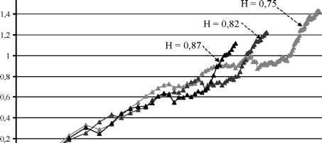 R/S и фазовый анализ ВР инвестиций в основной капитал по КЧР (рис.1) и по СК (рис.2) показал, что ряды обладают цикличностью и наследственной памятью [3, 4]. Значение показателя Херста по СК несколько выше, чем по КЧР, что свидетельствует о более устойчивых темпах инвестиций в основной капитал по СК. Глубина памяти колеблется в пределах от 4 до 16 месяцев по КЧР и от 4 до 17 месяцев по СК. Основной массив значений глубины приходится на интервал от 4 до 10 месяцев, что составляет 85,6% по КЧР и 87,7% по СК. Наиболее встречающейся является глубина равная 5 месяцам (17,3% для КЧР и 21,7% для СК). Период цикличности ВР адекватно представляется нечетким множеством {/, )}, центр тяжести которого приходится на I = 6, т.е. поведению ВР присуща цикличность с нечетким периодом равным полугодию как для КЧР так и для СК. Характер R/S - траектории суммы инвестиции в основной капитал по КЧР и СК (рис.3) практически повторяет R/S - траекторию по СК (рис.2). Такое совпадение можно объяснить одинаковой цикличностью и тем, что оба ВР являются персистентными и объем инвестиций по СК на порядок больше чем по КЧР и поэтому их суммирование практически не меняет характер R/S - траектории. Показатель Херста ВР сумм инвестиций по данным регионам составил Н = 0,87, что с небольшим увеличением соответствует результату по СК. Суммирование инвестиций в основной капитал и в индивидуальное жилищное строительство по КЧР показал иные результаты. Характер суммарной R/S - траектории, сохраняя примерно ту же персистентность (Н = 0,77), существенно отличается от траекторий в отдельности. Образовывается качественно иной новый порядок данных со своей цикличностью, персистентностью и наследственной памятью. Такой результат, очевидно, связан с тем, что складываются данные, несущие разного рода информации и имеющие различные инвестиционные горизонты и структуру. На рис.4 представлены R/S - траектории объемов инвестиций в основной капитал по КЧР различной детальности. С увеличением интервала выборки данных зазубренность зависимости инвестиции - время уменьшается, а показатель Херста возрастает. Сам же характер R/S - траектории практически остается неизменным с некоторыми не существенными колебаниями. При более коротких интервалах или при более высоких частотах наблюдается большее количество шума в данных. Менее частое осуществление выборки минимизирует воздействие шума и устраняет воздействие фрактального шума, который присутствует при более высоких частотах. Циклы, появляющиеся в одно месячном ВР, остаются и в двух и трех месячных ВР. Изменение показателя Херста при различных частотах выборки может свидетельствовать на то, что информационный поток оказывает различное влияние на различных интервалах выборки, и различные инвестиционные горизонты могут иметь различные структуры. На более коротких интервалах выборки персистентность ВР более низкая, чем на более длинных интервалах. Анализ жилищного строительства по КЧР показал, что R/S - траектория объемов индивидуального жилищного строительства (ИЖС) менее зазубрена и более трендоустойчива (рис.5), чем всего жилищного строительства (ВЖС), что свидетельствует о некотором снижении его персистентности (рис.6). Цикличность ВР ИЖС более выражена. Показатель Херста ВР ВЖС (Н = 0,73) несколько ниже, чем ВР ИЖС (Н = 0,79). Факт присутствия отклонений говорит также о некото